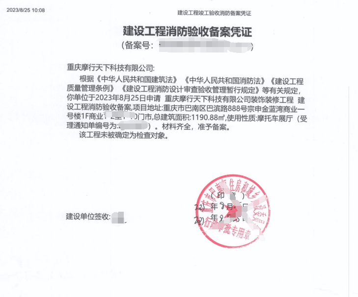 重慶摩行天下有限公司消防備案憑證: