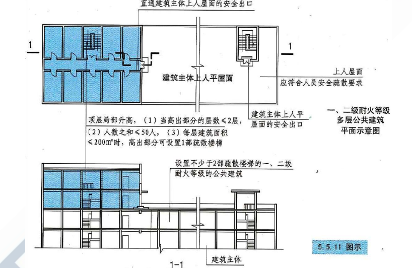 (3)一、二級耐火等級多層公共建筑,當設置不少于2部疏散樓梯且頂層局部升高層數不超過2層、人數之和不超過50人、每層建筑面積不大于200㎡時,該局部高出部位可設置一部與下部主體建筑樓梯間直接連通的疏散樓梯,但至少應另設置一個直通主體建筑上人平屋面的安全出口,該上人屋面應符合人員安全疏散要求。